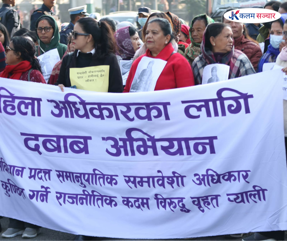 काठमाडौं । समानुपातिक समावेशी अधिकारलाई राजनीतिक दाउपेचको विषय बनाएर कमजोर पार्न खोजिएको भन्दै शुक्रबार राजधानीका सडकमा महिलाहरूले खबरदारी गरेका छन् ।