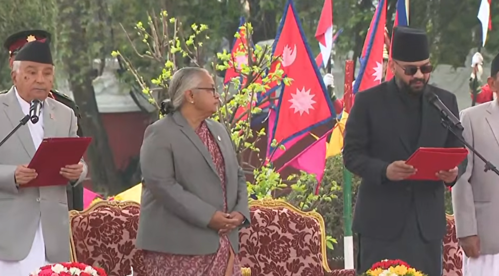 काठमाडौँ, १३ चैतः राष्ट्रपति रामचन्द्र पौडेलसमक्ष नवनियुक्त प्रधानमन्त्री बालेन्द्र शाहले पद तथा गोपनीयताको शपथ लिनुभएको छ । राष्ट्रपति पौडेलले राष्ट्रपतिको कार्यालयमा आज आयोजित विशेष समारोहमा राष्ट्रिय स्वतन्त्र पार्टी (रास्वपा)का संसदीय दलका नेता शाहलाई शपथ गराउनुभएको हो । राष्ट्रपति पौडेलले आजै बिहान उहाँलाई नेपालको संविधानको धारा, ७६ को उपधारा (१) बमोजिम प्रधानमन्त्री पदमा नियुक्त गर्नुभएको थियो । समारोहमा उपराष्ट्रपति रामसहायप्रसाद यादव, प्रधानमन्त्री सुशीला कार्की, प्रधानन्यायाधीश प्रकाशमानसिंह राउत, राष्ट्रियसभाका अध्यक्ष नारायणप्रसाद दाहाल, निवर्तमानप्रधानमन्त्री सुशीला कार्की र पूर्व प्रधानमन्त्रीहरु उपस्थित हुनुहुन्थ्यो । समारोहमा संवैधानिक निकायका प्रमुख, सरकारका विशिष्ट श्रेणीका अधिकृत, सुरक्षा निकायका प्रमुख, यहाँस्थित विभिन्न कूटनीतिक नियोगका पदाधिकारीलगायत उपस्थित हुनुहुन्थ्यो । प्रधानमन्त्रीको शपथ पहिलोपटक वैदिक–सनातन परम्परा झल्किने गरी गरिएको थियो । समारोहमा सात शङ्खबाट शङ्खनादसँगै १०८ जना वटुकले स्वस्ति–शान्ति वाचन र १०८ बौद्ध भिक्षु लामाले शुभ–मङ्गल पाठ गर्नुभएको थियो । रास्वपा वरिष्ठ नेता शाहलाई बिहीबार सो पार्टीले संसदीय दलका नेतामा सर्वसम्मत चयन गरेको थियो ।