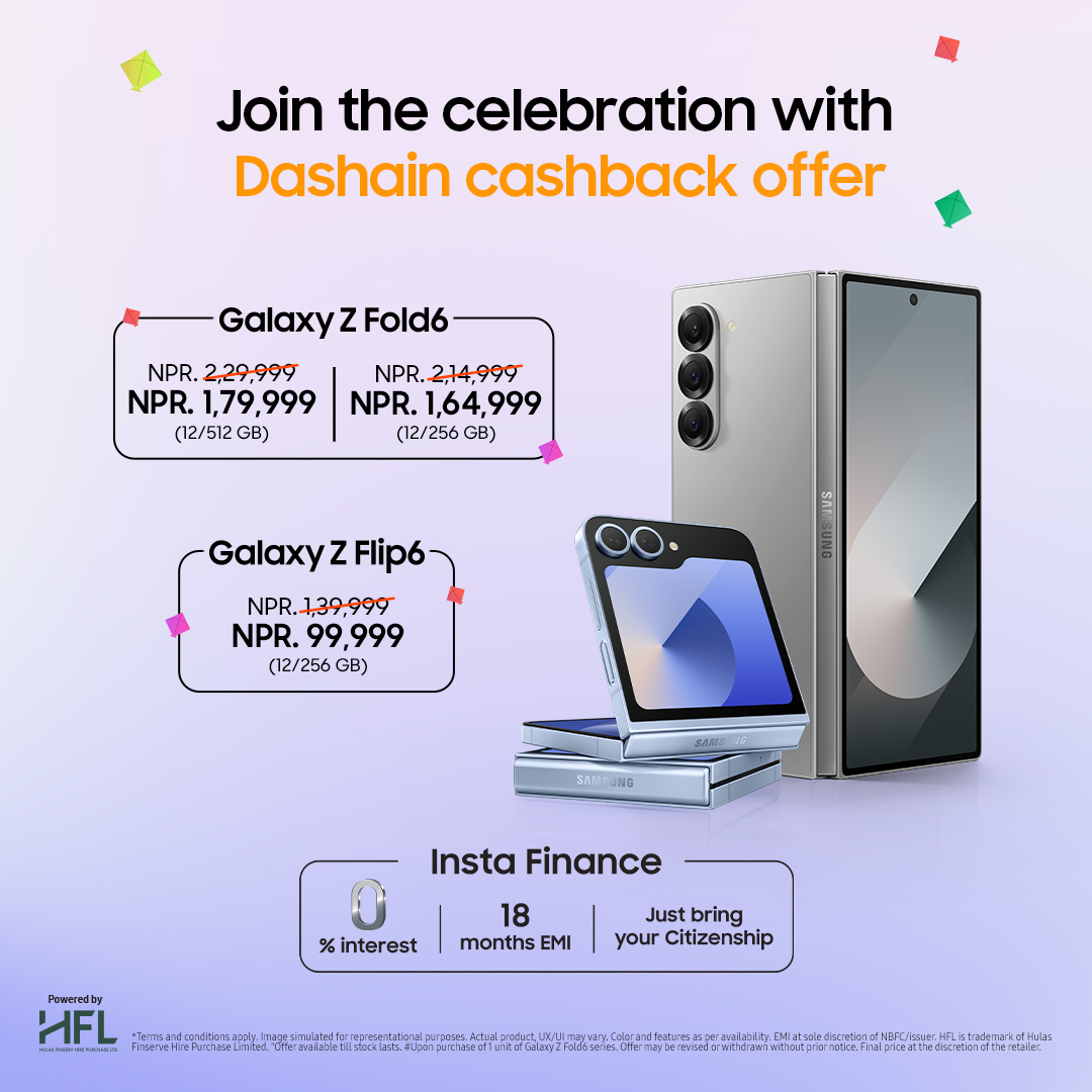 - सामसङको दशैं अफर : ग्यालेक्सी जेड फोल्ड६ र फ्लिप६ को मूल्य घट्यो