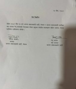 ‘मिति २०८२ पुस १३ गते जनता समाजवादी पार्टी, नेपाल र जनता समाजवादी पार्टीका सह–अध्यक्ष रेणु यादवको नेतृत्वमा रहेका बहुमत केन्द्रीय सदस्यहरू सहित जसपा, नेपाल पार्टीसँग एकीकरण गरियो’ सहमति पत्रमा उल्लेख छ ।
