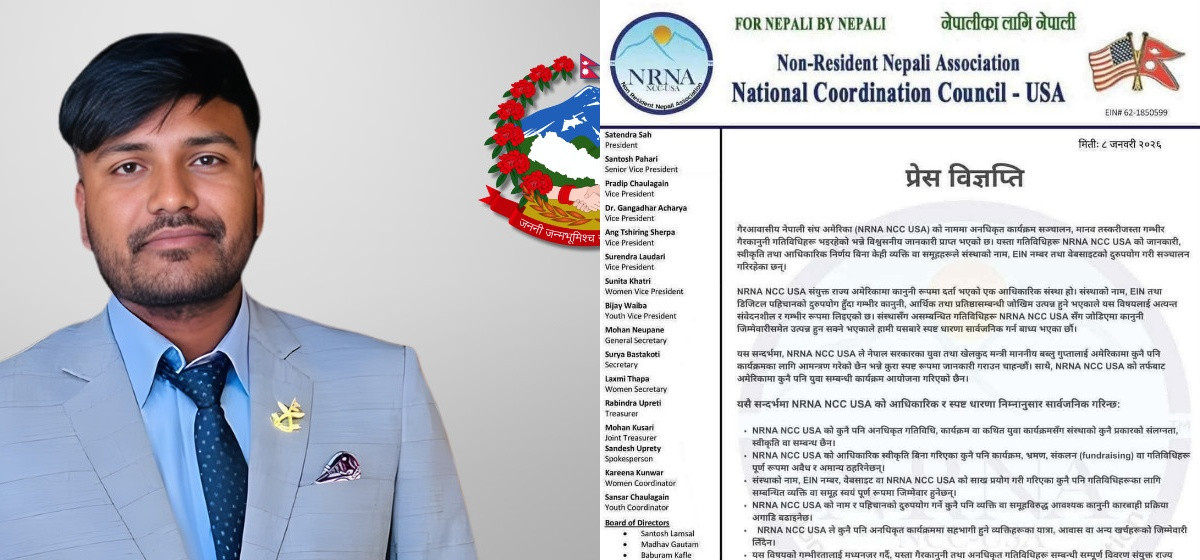 काठमाडौँ । युवा तथा खेलकुदमन्त्री बब्लु गुप्ताको अमेरिका भ्रमणलाई लिएर विवाद चर्किएको छ । गैरआवासीय नेपाली संघ अमेरिका अर्थात् एनआरएनए अमेरिकाका नाममा दुई फरक–फरक विज्ञप्ति सार्वजनिक भएपछि भ्रम थपिएको हो ।