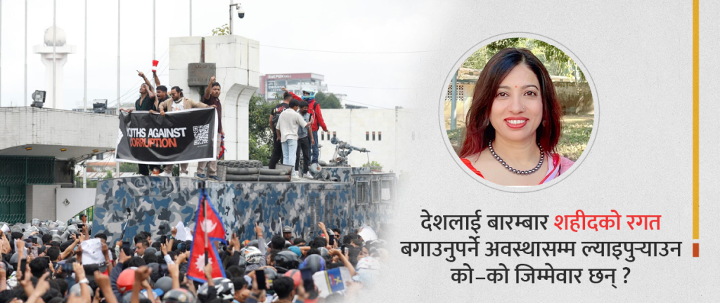 हिजोआज म सोचिबस्छु — आखिर को–को जिम्मेवार छन् यो देशलाई बारम्बार शहीदको रगत बगाउनुपर्ने अवस्थासम्म ल्याइपुर्याउन ? अनि विस्तारै अरूतिर सोझिंदै गरेको औंला आफैंतर्फ सोझिएको पाउँछु । मेरो पुस्ताको कायरता, गैर–जिम्मेवारीपन र अवसरवाद नै देशको प्रगतिको बाधक रहेछ।
